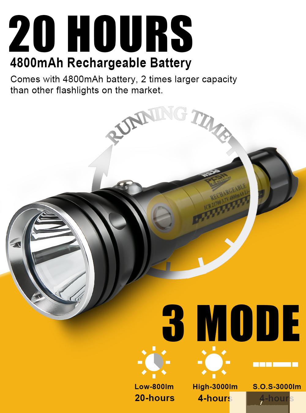 - ã€MAX 20 HOURS BATTERY LIFE】The DF30Y underwater flashlight comes with a 4800mAh rechargeable battery that lasts up to 4 hours in bright light mode and over 20 hours in low light mode