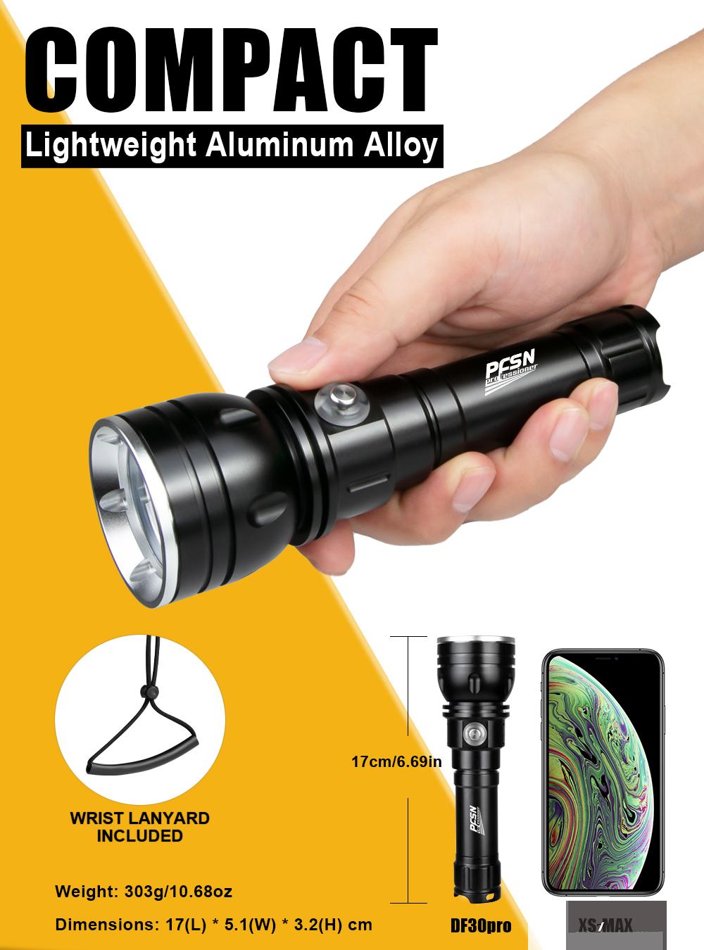 - ã€COMPACT & LIGHTWEGHT & RUGGED】The compact scuba light consists of high-precision components and a military-grade lll hard anodized aluminum alloy housing that is corrosion-resistant and rugged enough to withstand the harshest & saltwater conditions